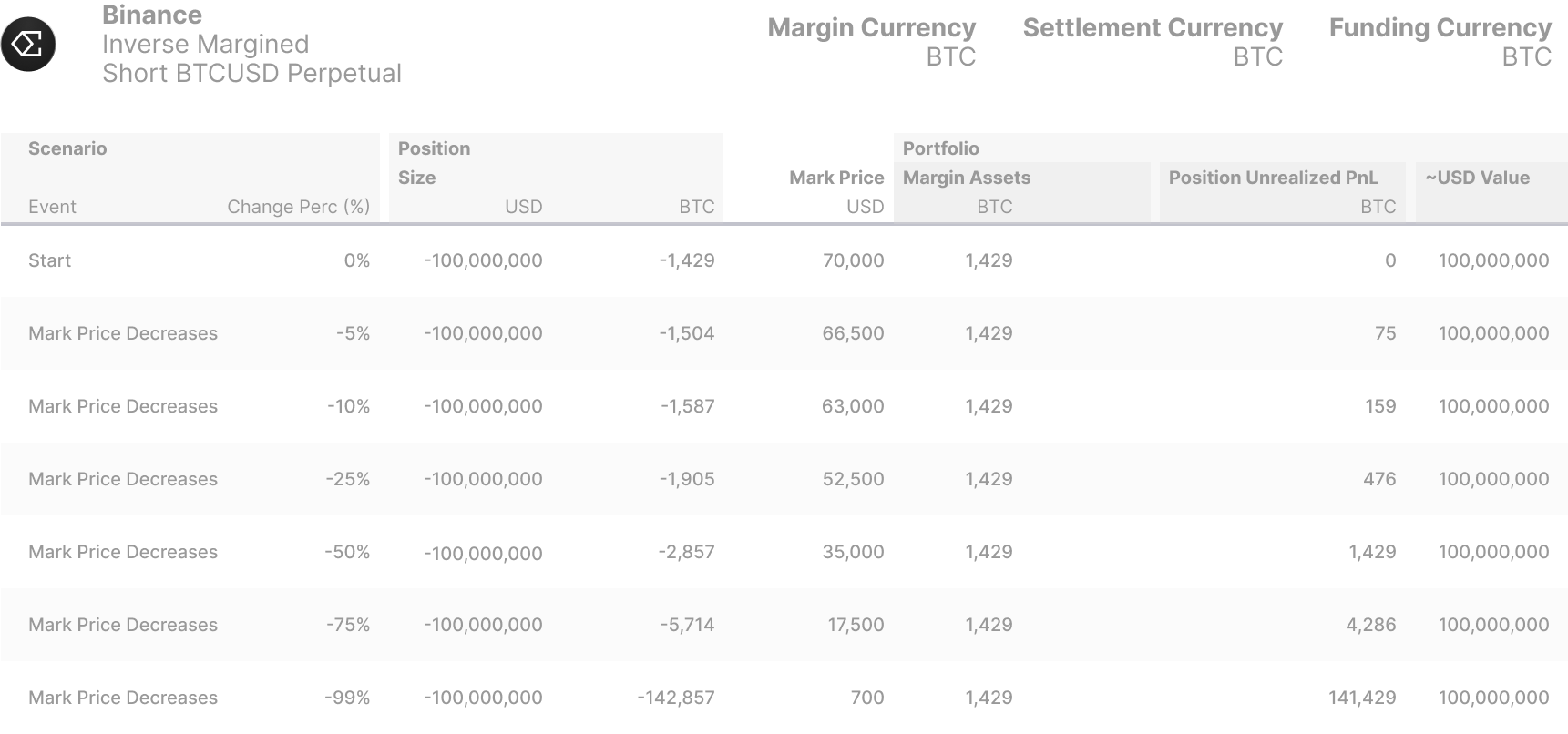 <figure><img src="https://596495599-files.gitbook.io/~/files/v0/b/gitbook-x-prod.appspot.com/o/spaces%2FsBsPyff5ft3inFy9jyjt%2Fuploads%2FEfiXEg1eLkSJzD2VRnMq%2FScenario%20Analysis%20-%20Binance%20Inverse%20Margined%20Positions.png?alt=media&#x26;token=408e507f-16d9-4484-ad63-6294c2d3daf2" alt=""><figcaption><p>Inverse Margined Positions</p></figcaption></figure>