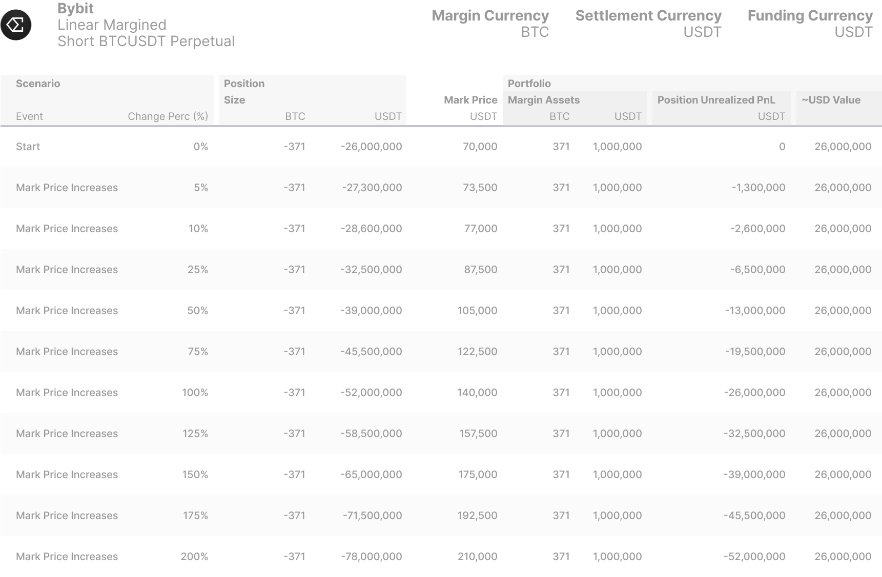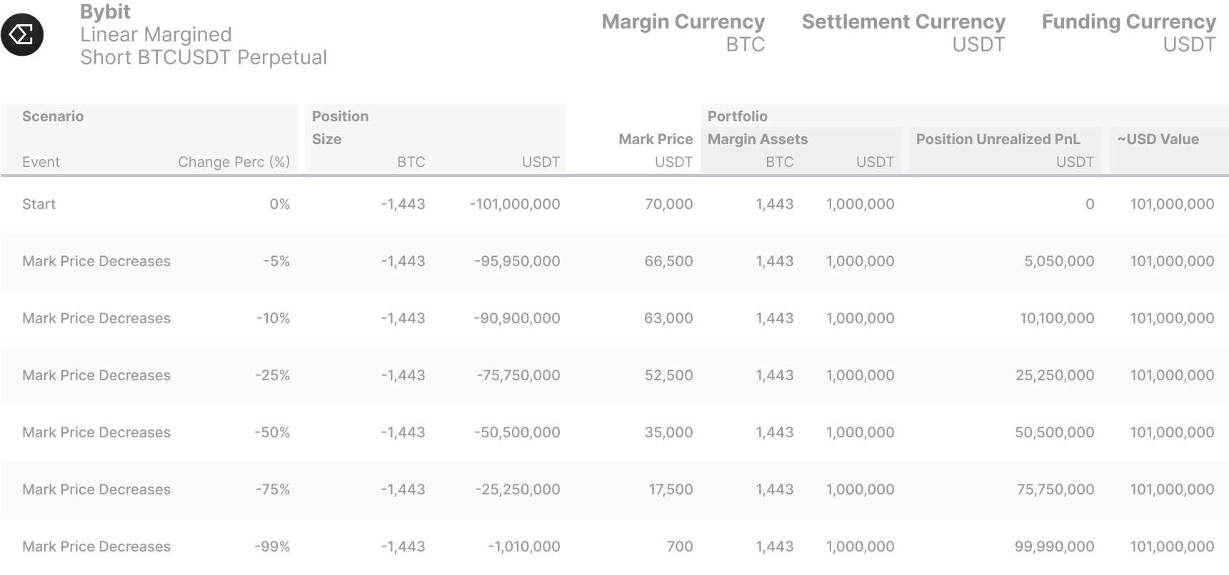 <figure><img src="https://596495599-files.gitbook.io/~/files/v0/b/gitbook-x-prod.appspot.com/o/spaces%2FsBsPyff5ft3inFy9jyjt%2Fuploads%2FScmCB8OZiXPpOgZ69yYK%2FScenario%20Analysis%20-%20Bybit%20Linear%20Margined%20Positions.png?alt=media&#x26;token=70562628-1f25-4999-835a-a0f40ec3ed88" alt=""><figcaption><p>Linear Margined Positions</p></figcaption></figure>